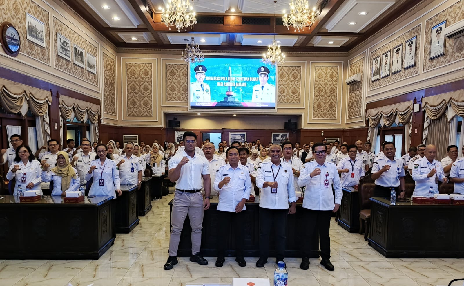 MALANGKOTA – Wakil Wali Kota Malang Ali Muthohirin membuka Sosialisasi Pola Hidup Sehat dan Bugar bagi Aparatur Sipil Negara (ASN) Kota Malang yang digelar oleh Dinas Kesehatan (Dinkes) Kota Malang di Ruang Sidang Balai Kota Malang, Rabu (26/2/2025).
