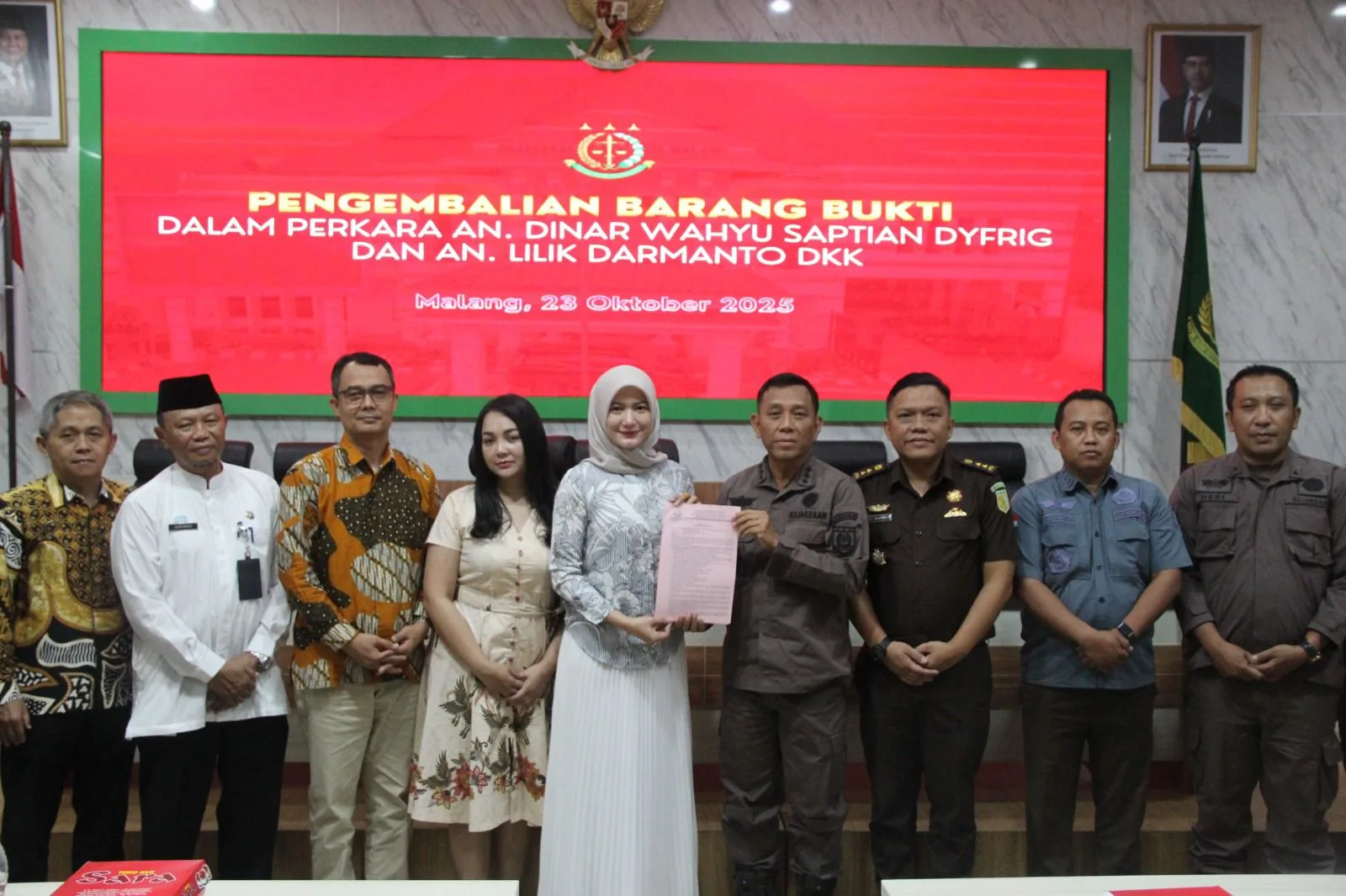 PENAJATIM.COM – Kejaksaan Negeri (Kejari) Kota Malang melaksanakan kegiatan pengembalian barang bukti dalam perkara tindak pidana atas nama Terpidana Dinar Wahyu Saptian Dyfrig dan Lilik Darmanto Dkk. kepada para korban. Kegiatan ini berlangsung di Aula Kantor Kejaksaan Negeri Kota Malang, Jalan Simpang Panji Suroso No. 5, pada hari Kamis, 23 Oktober 2025, mulai pukul 10.00 hingga 11.45 WIB.