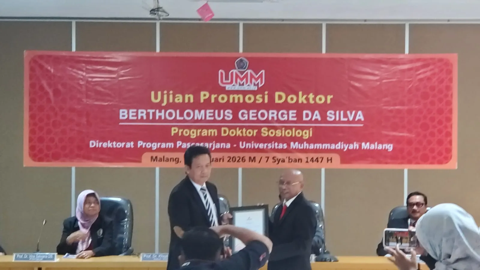 PENAJATIM – Praktik politik tidak selalu berbicara lewat mimbar dan baliho. Di Malang Raya, ia sering hadir dalam rupa program sosial, bantuan, dan relasi personal. Fenomena inilah yang dikaji Bertholomeus George da Silva dalam ujian promosi doktor Program Studi Sosiologi Universitas Muhammadiyah Malang, Senin 26 Januari 2026.