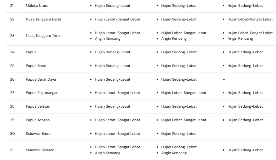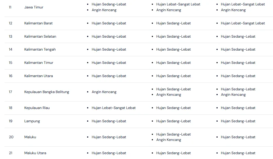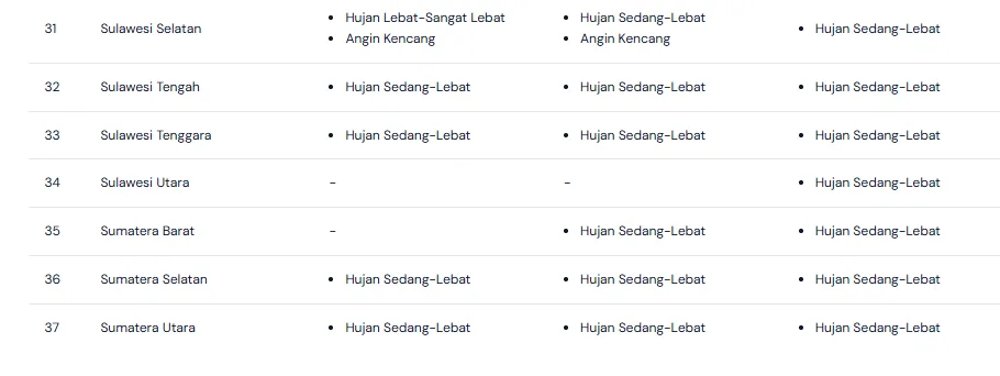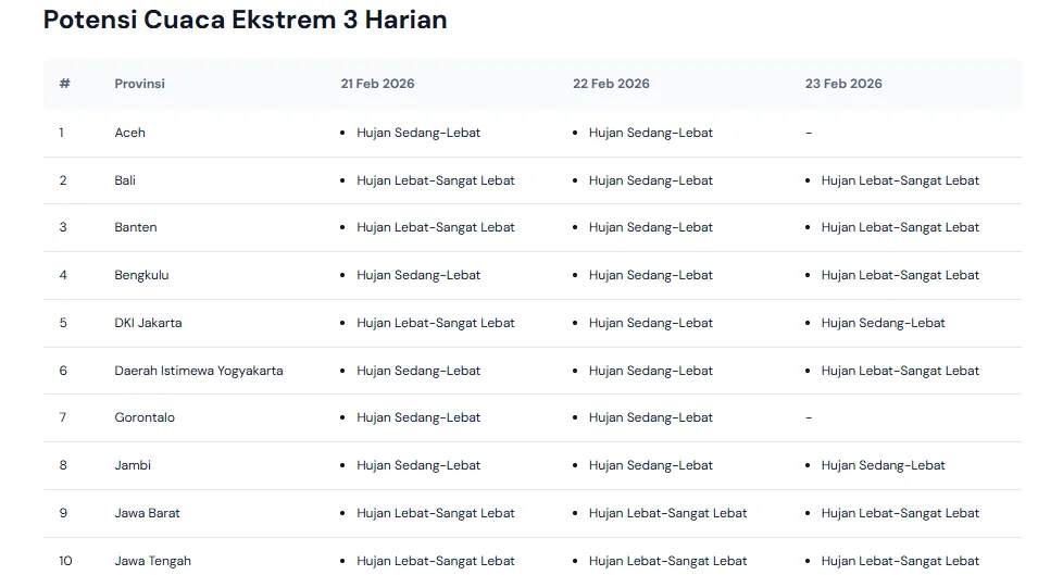 PENAJATIM – Menjelang akhir pekan, masyarakat di berbagai provinsi Indonesia perlu bersiap menghadapi potensi hujan. Pola musim hujan yang masih berlangsung hingga akhir Februari 2026 terus membentuk awan tebal di banyak wilayah. Pada 22–23 Februari 2026, prakiraan cuaca menunjukkan langit berawan dengan hujan yang turun pada siang hingga sore hari. Sejumlah daerah berpotensi mengalami hujan sedang hingga lebat disertai angin kencang dan petir. Suhu udara berkisar antara 24–31 derajat Celsius dan tetap terasa hangat. Kelembapan udara yang tinggi membuat suasana terasa lebih gerah sebelum hujan datang. Warga di kawasan rawan genangan dan banjir perlu meningkatkan kewaspadaan. Pemerintah daerah dan masyarakat sebaiknya memantau pembaruan informasi cuaca agar dapat menyesuaikan aktivitas harian secara tepat.